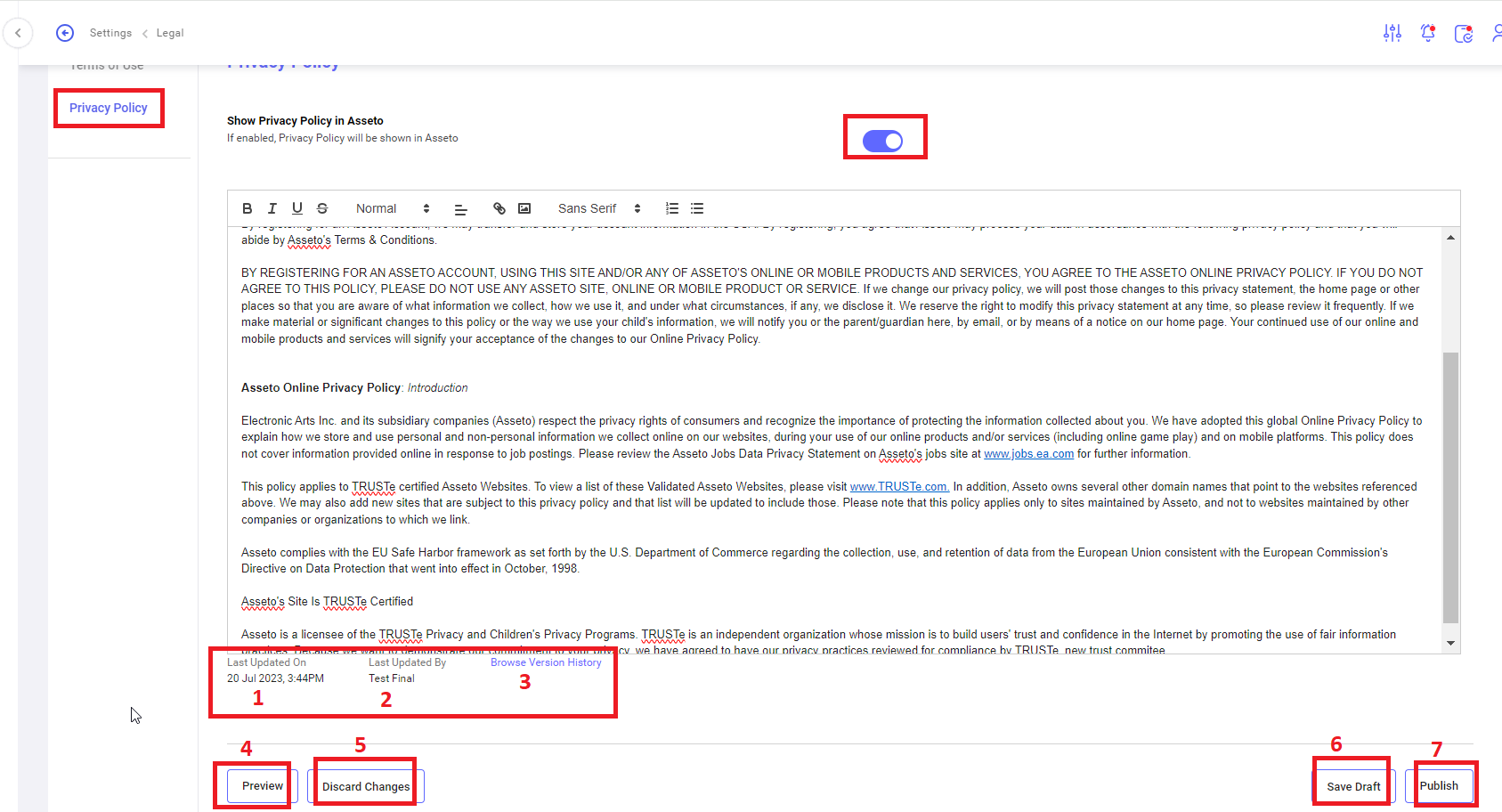 User can setup the Terms of use and Privacy policy for asseto. Options are available as menu on left side, Privacy policy is highlighted by default.