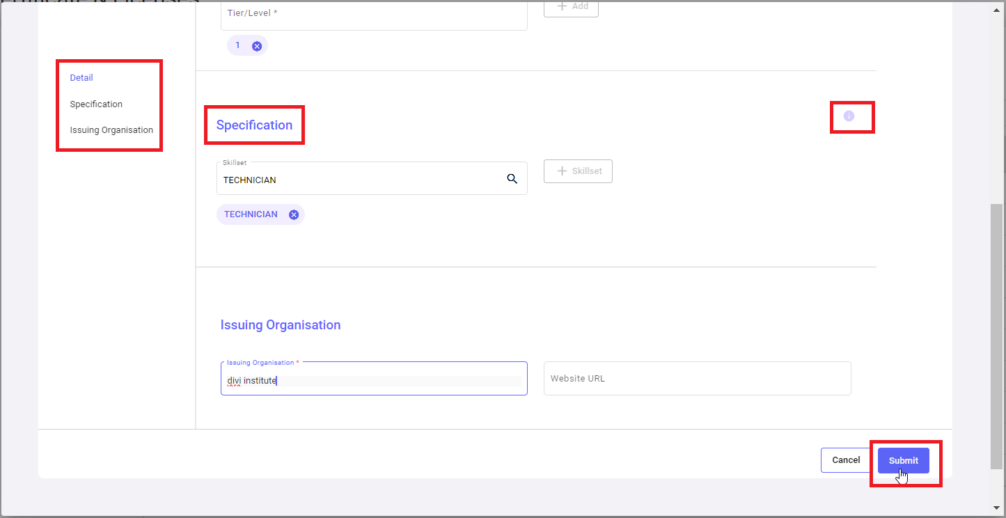 Tooltip icon: click on tool tip icon nearby “specification” field to view the specification concept for selected category.