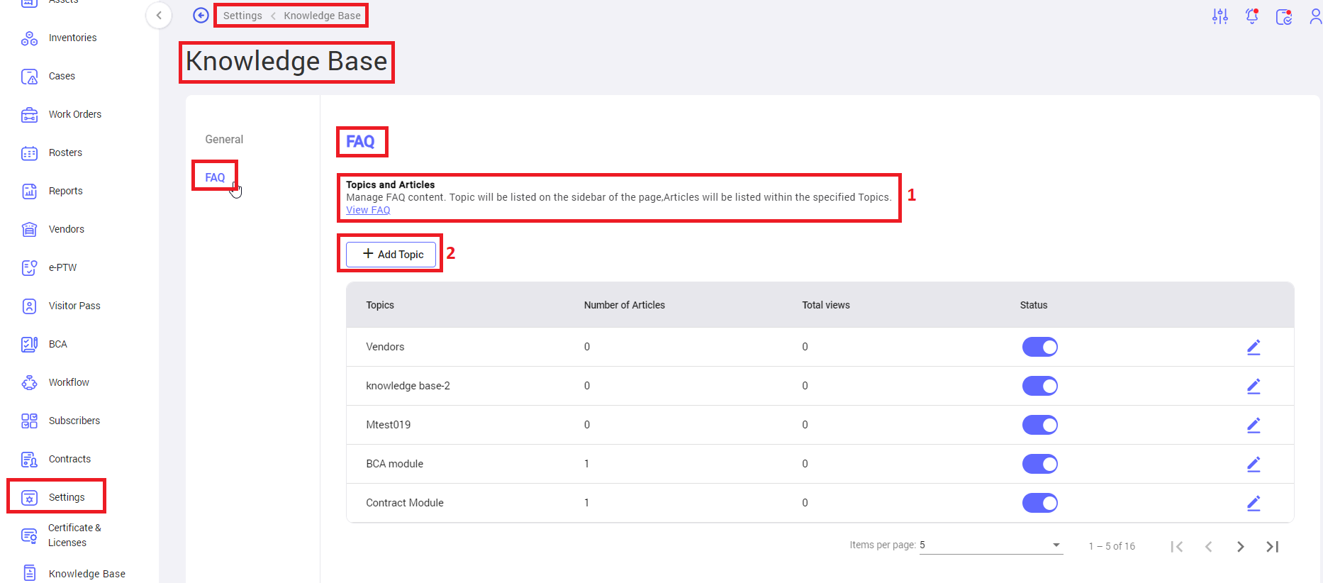 1. Topics and Articles: User can manage FAQ content by using this feature. Topic will be listed on the sidebar of the knowledge base page.