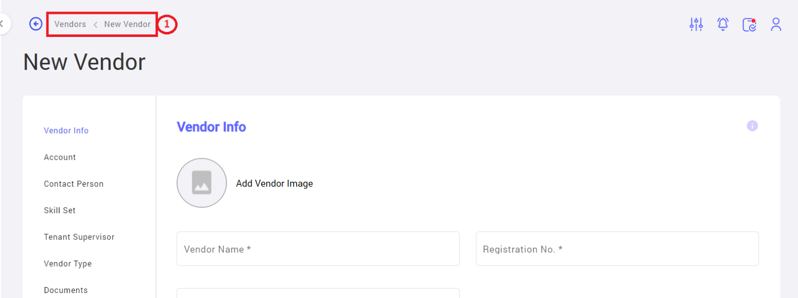 1. Vendor Module: Vendor can be configured by navigating to the module, Vendors >> New Vendor. Key in all the required inputs & save.