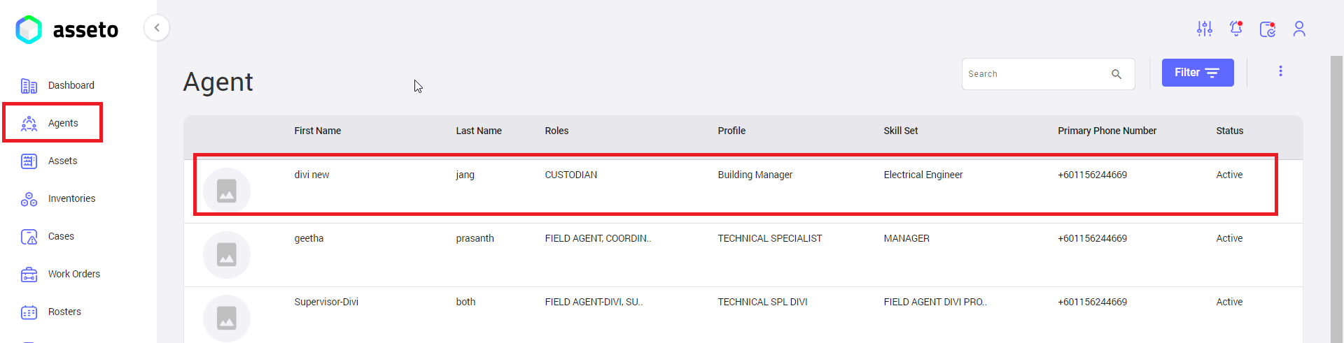 Click the save button to onboard the new agent. An "Agent added successfully" confirmation message will appear, and the screen will navigate to the agent dashboard, where the newly added agent will be displayed at the top of the list.