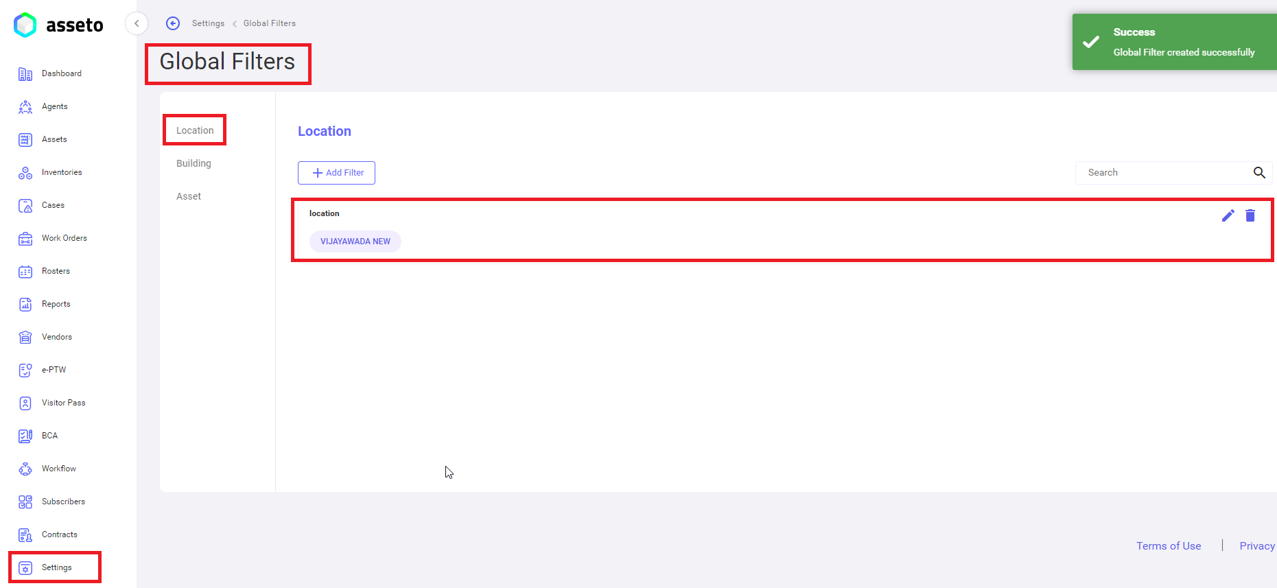 User can add new filter based on asset, building and location.