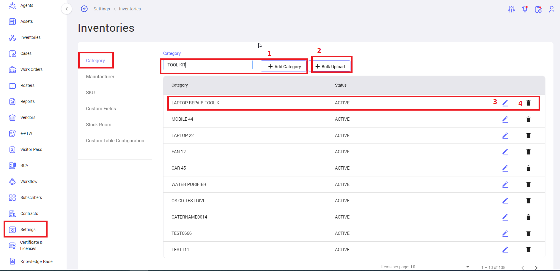 - Delete Category: The user can delete already created categories by clicking on the delete icon available in each row of the categories list.